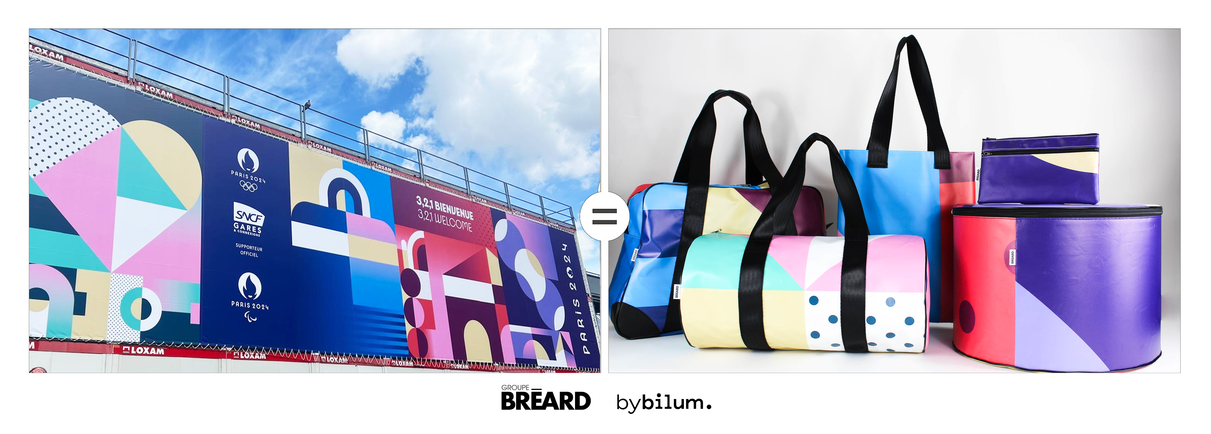 Upcycling de la toile "Games Time" exposée à l'occasion de Paris 2024. Elle a été transformée en différents sacs et accessoires.