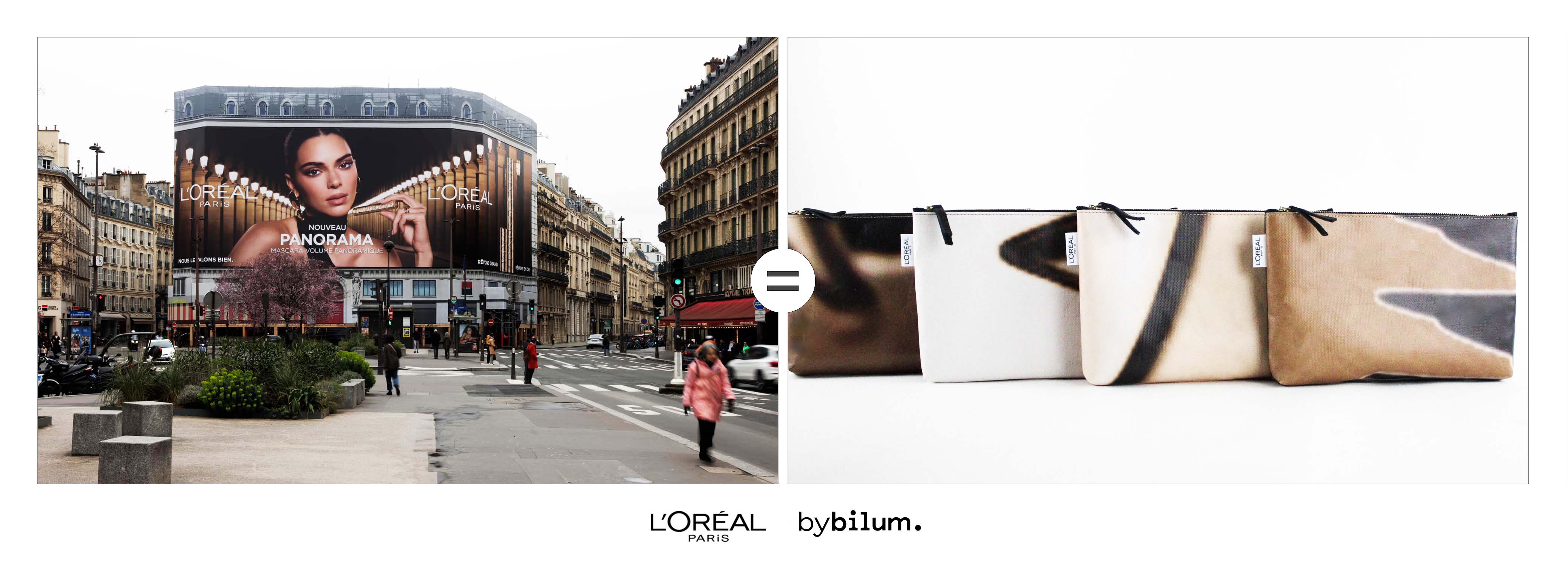 A l'occasion du lancement du mascara Panorama, l'Oreal a exposé une bâche géante Place d'Estienne D'Orves. Bilum a transformé cette toile en plusieurs centaines de trousses.