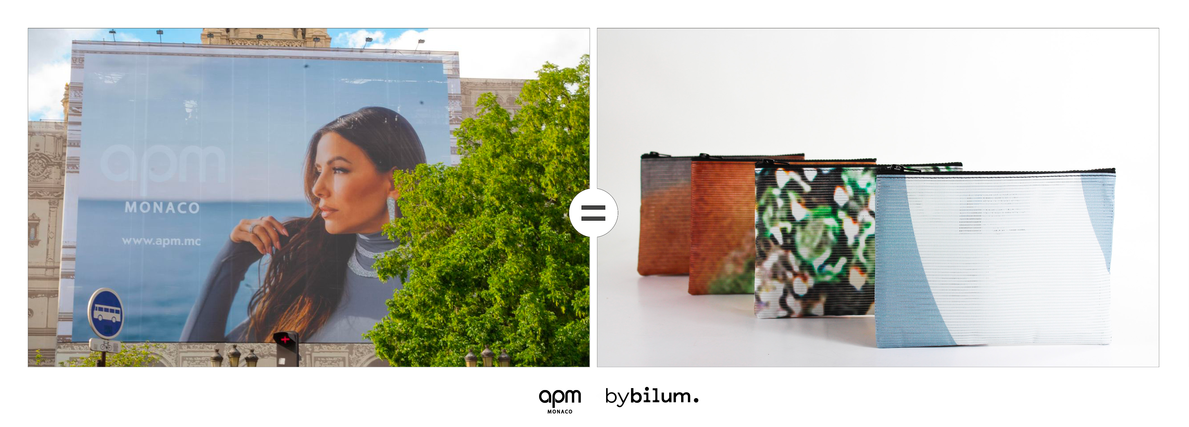 Upcycling de la toile APM Monaco exposée sur l'Eglise de la Trinité durant l'été 2025, en plusieurs centaines de trousses.