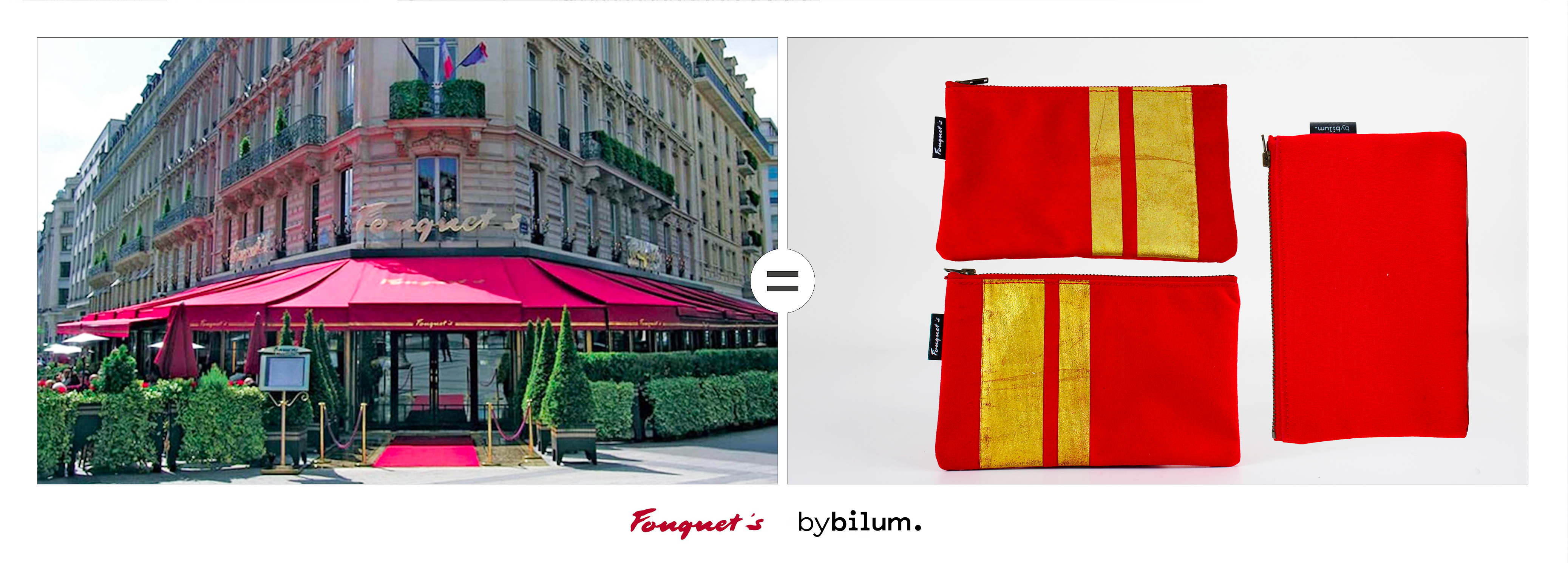 Partenaires de longue date, Elis et Le Jacquard Français nous ont transmis respectivement des sacs réformés et des chutes de tissus, que nous avons confectionnés en trousses bi-faces pour symboliser leur coopération. Les pièces, toutes uniques, ont été offertes lors du salon EquipHotel.